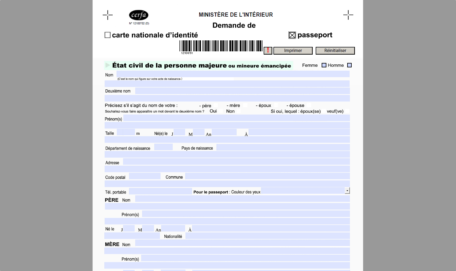 Formulaire Passeport. Photocopies de tous les documents civils. Télécharger gratuitement (3,3 mo) français.